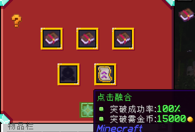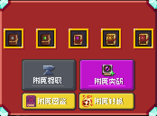 进行附魔突破时,上面的槽位放置相同的最高等级附魔书,下左放,下右放,最下方的确认按钮可以查看成功率及所需